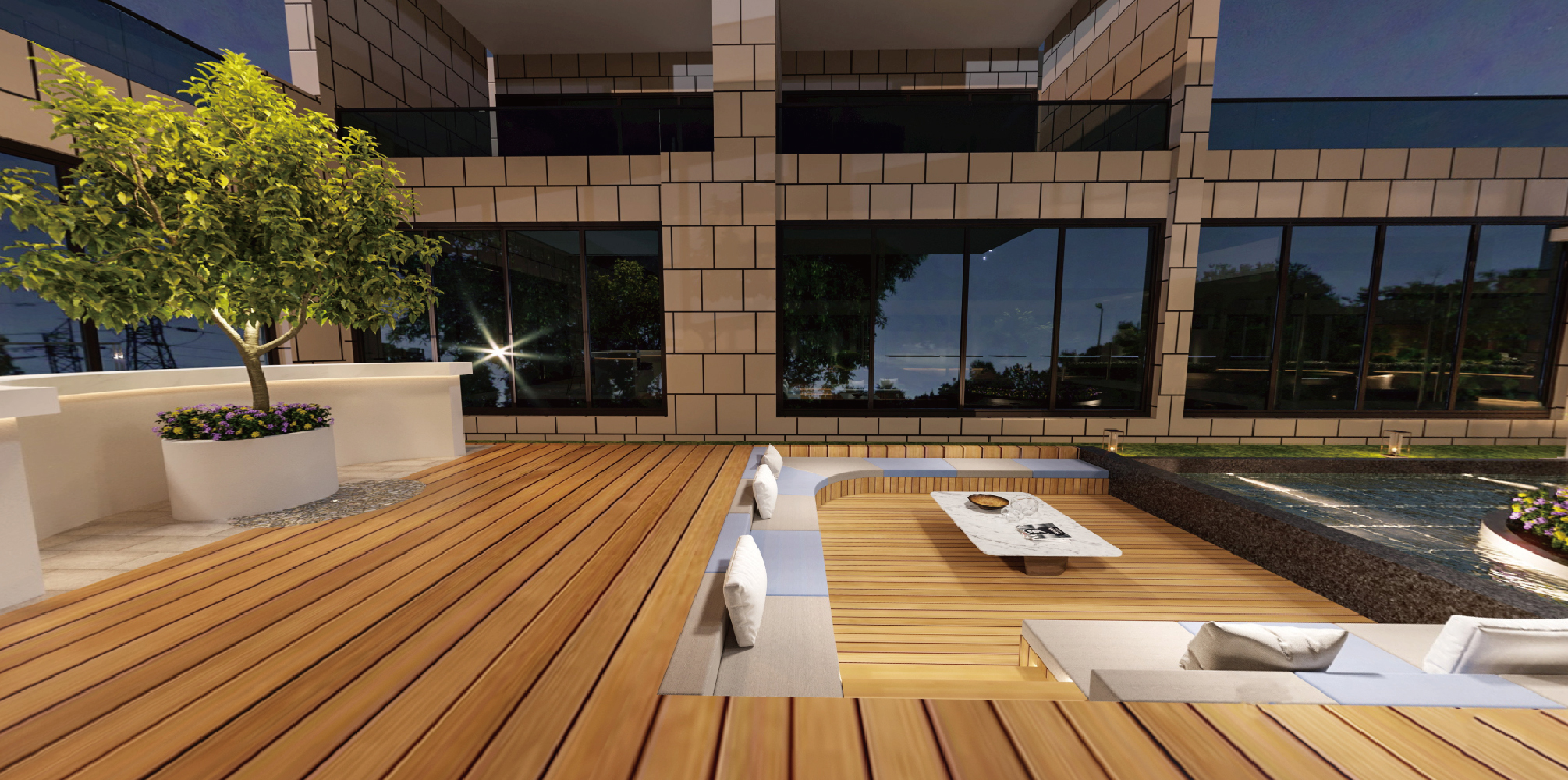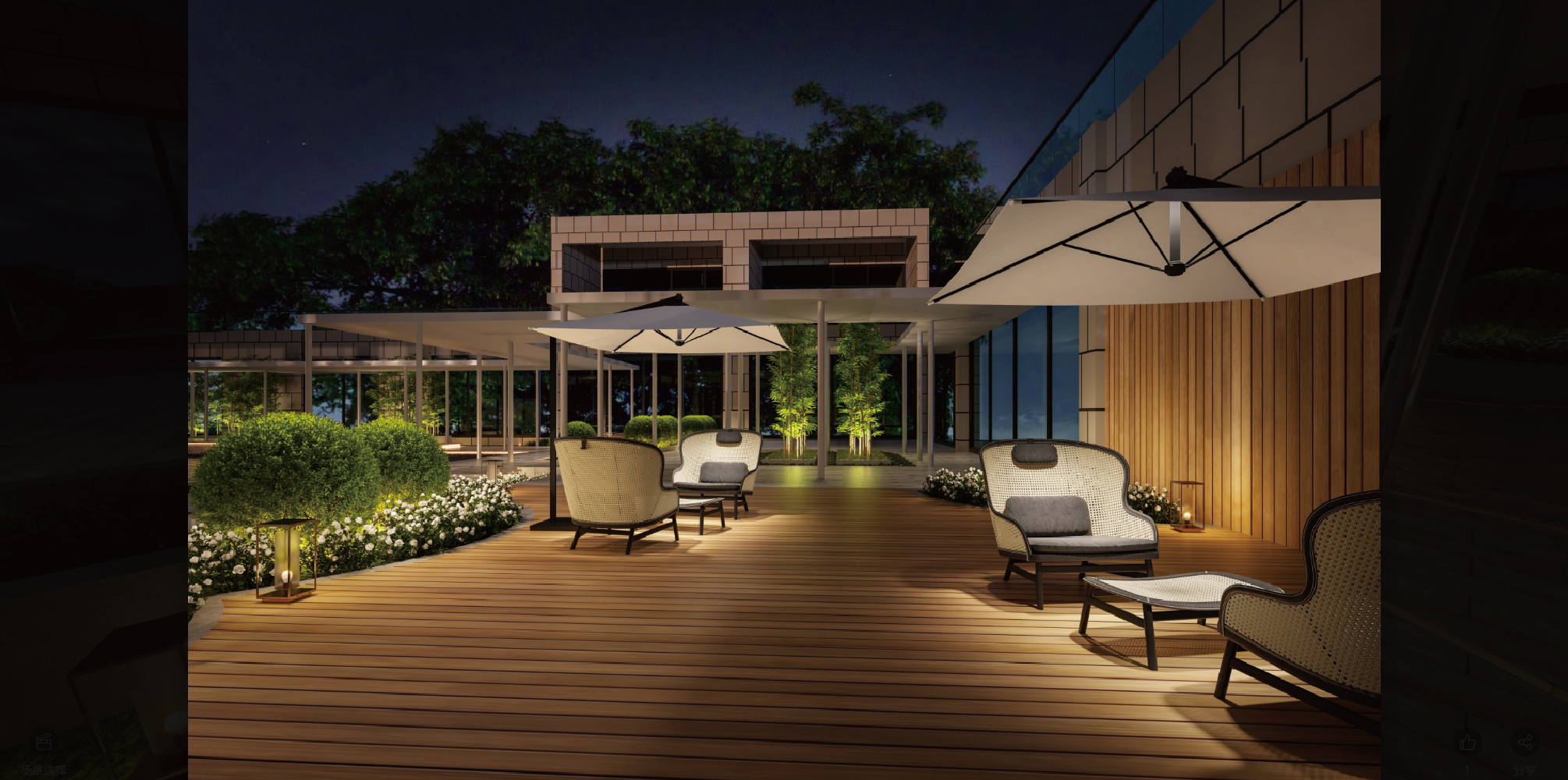 水面、古樹是休息區(qū)的主要元素,在圓的包容下,沉浸式的“浮夢之森”躍然成形。天人合一的設(shè)計邏輯貫穿始終,設(shè)計師融合東方與當(dāng)代的審美意趣,根據(jù)建筑特性自由地塑造結(jié)構(gòu),將自然消融在場地內(nèi)外。
