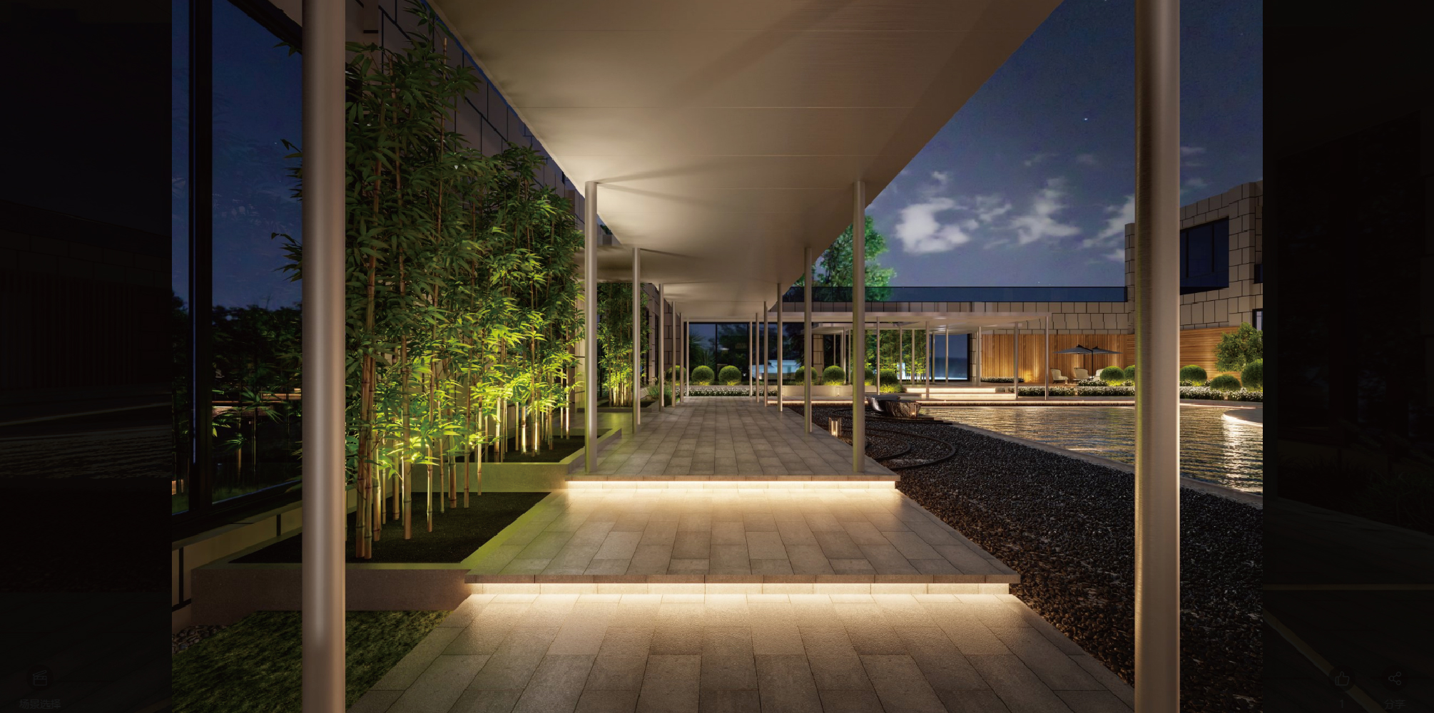 廊道的景觀采用了“竹”元素,營造出古典的中華園林景觀,烘托出了從藝術(shù)到現(xiàn)實,從身體到心靈,是想象力的生長點和出發(fā)點的氣氛。人行走其間,感應(yīng)自然的玄妙,仿佛經(jīng)歷一場洗禮,重啟了無限的生命力,意識引向深遠(yuǎn)的未來與遠(yuǎn)方。